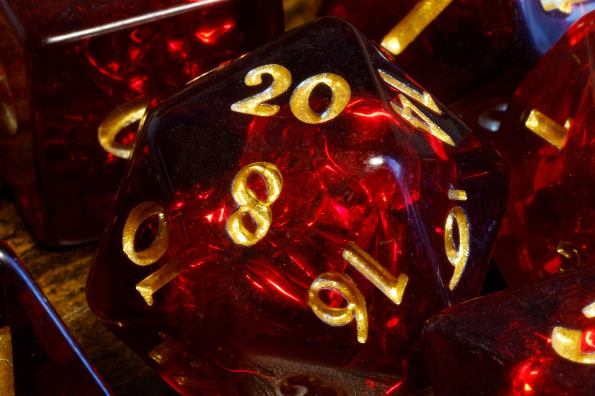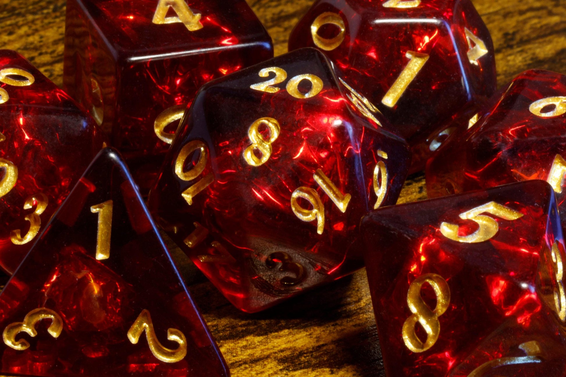 Un ensemble de dés rouge foncé transparent avec des inclusions holographiques scintillantes. Parfait pour ajouter une touche de magie fruitée à vos lancers !
