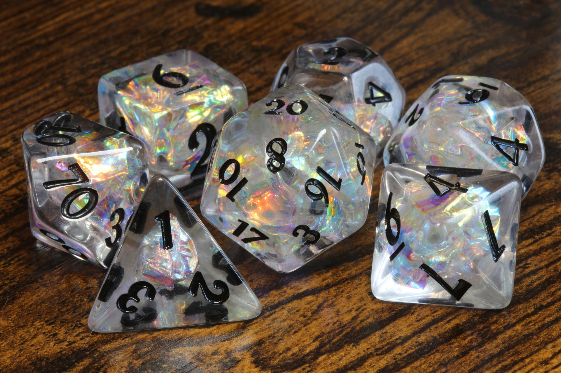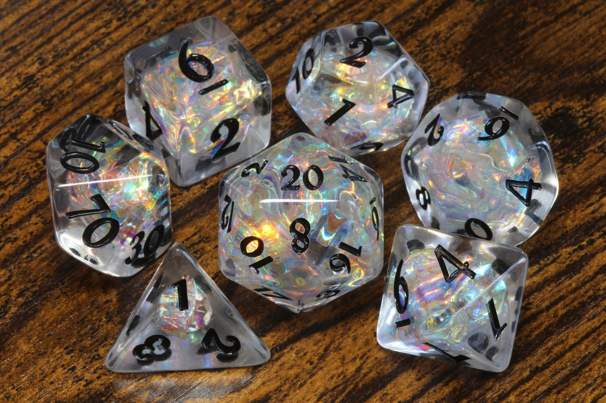 Ensemble de dés Opale Glacée – Dés transparents holographiques avec inclusions arc-en-ciel
