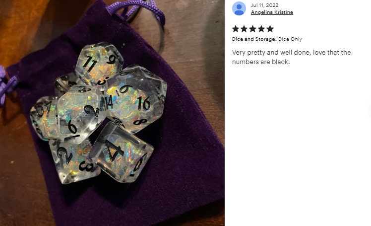 Cet ensemble de 7 dés contient de jolies feuilles holographiques à l’intérieur.