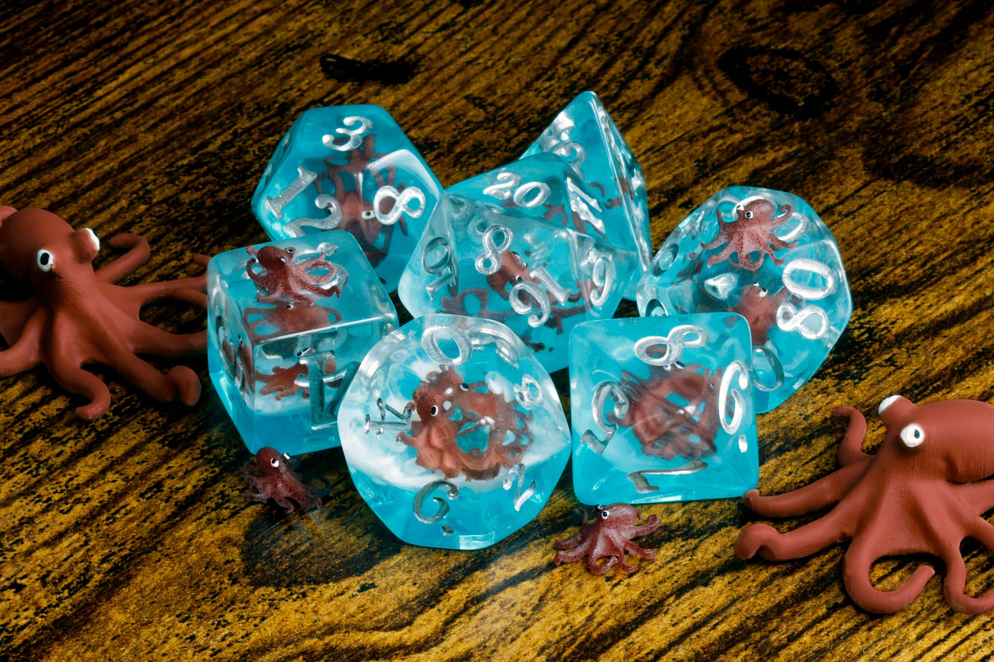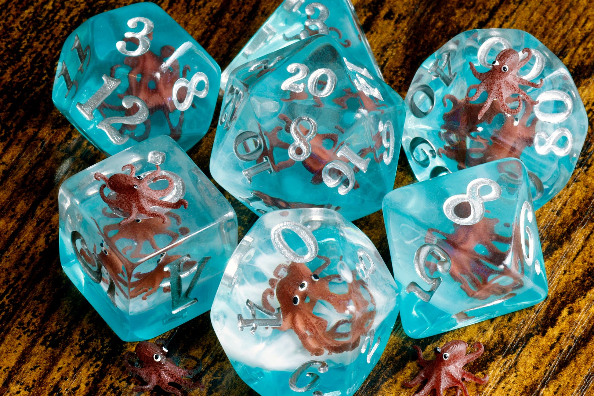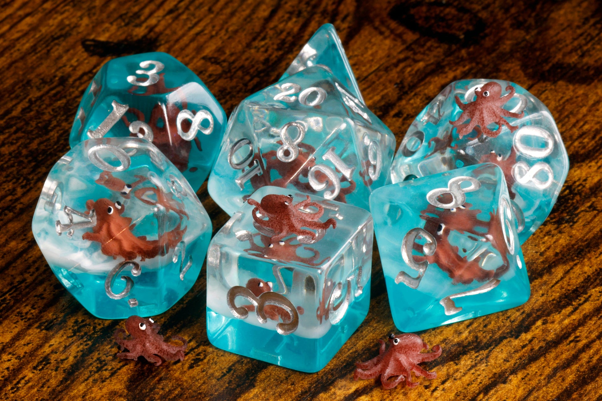 Cet ensemble de dés contient de petites pieuvres à l’intérieur.