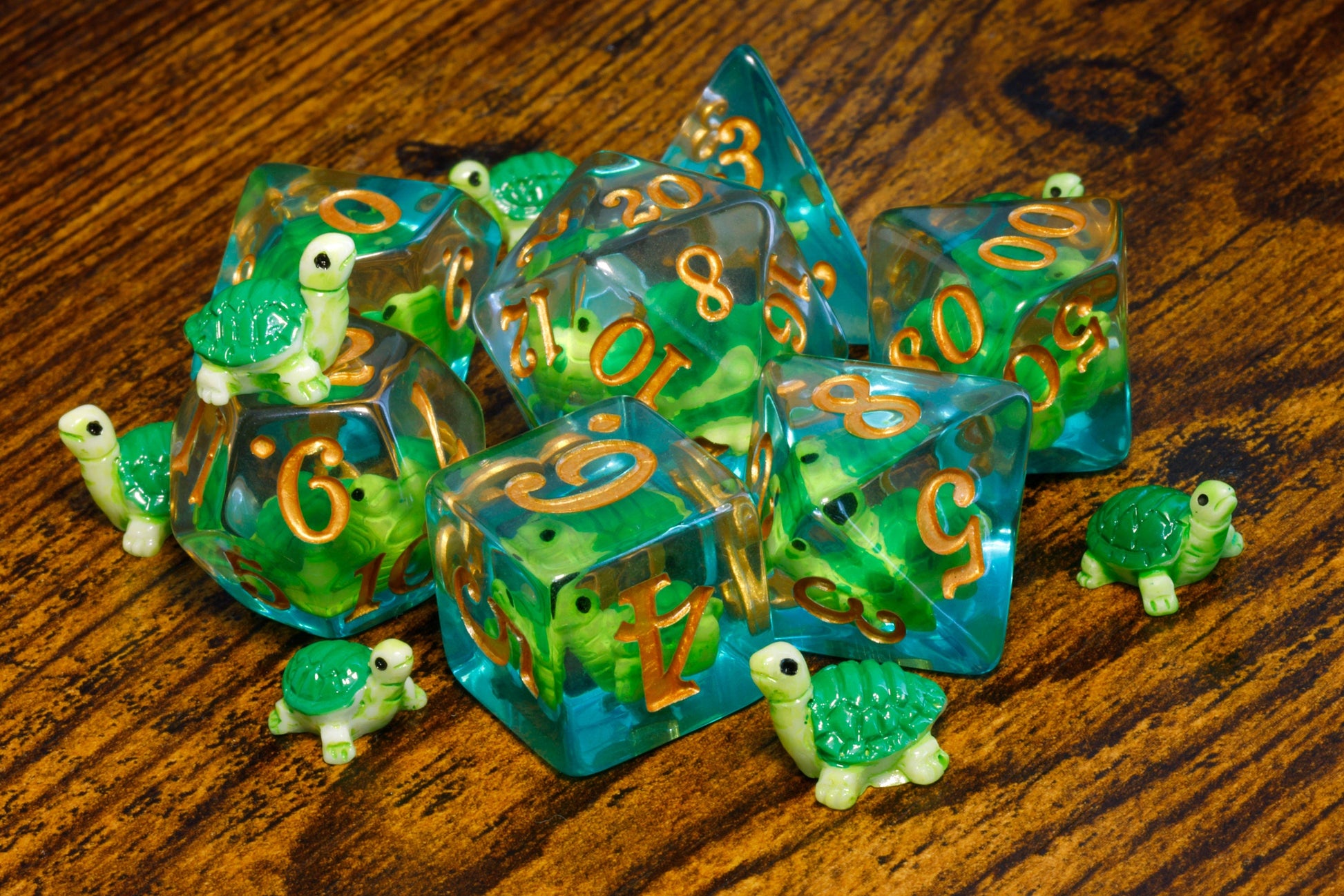 Laissez-vous charmer par ces adorables dés avec petites tortues vertes ! Enfermés dans une magnifique couche bleue évoquant l’eau, chaque dé présente de minuscules tortues, ce qui en fait un choix idéal pour un personnage Tortle.