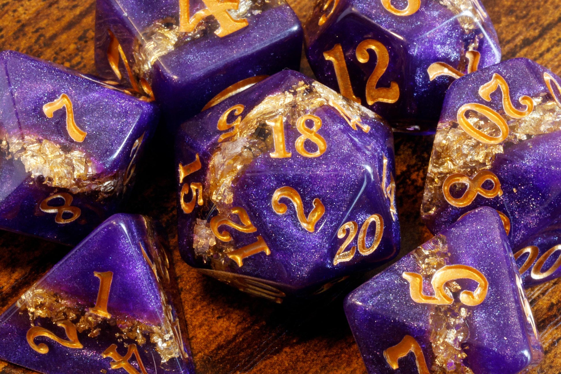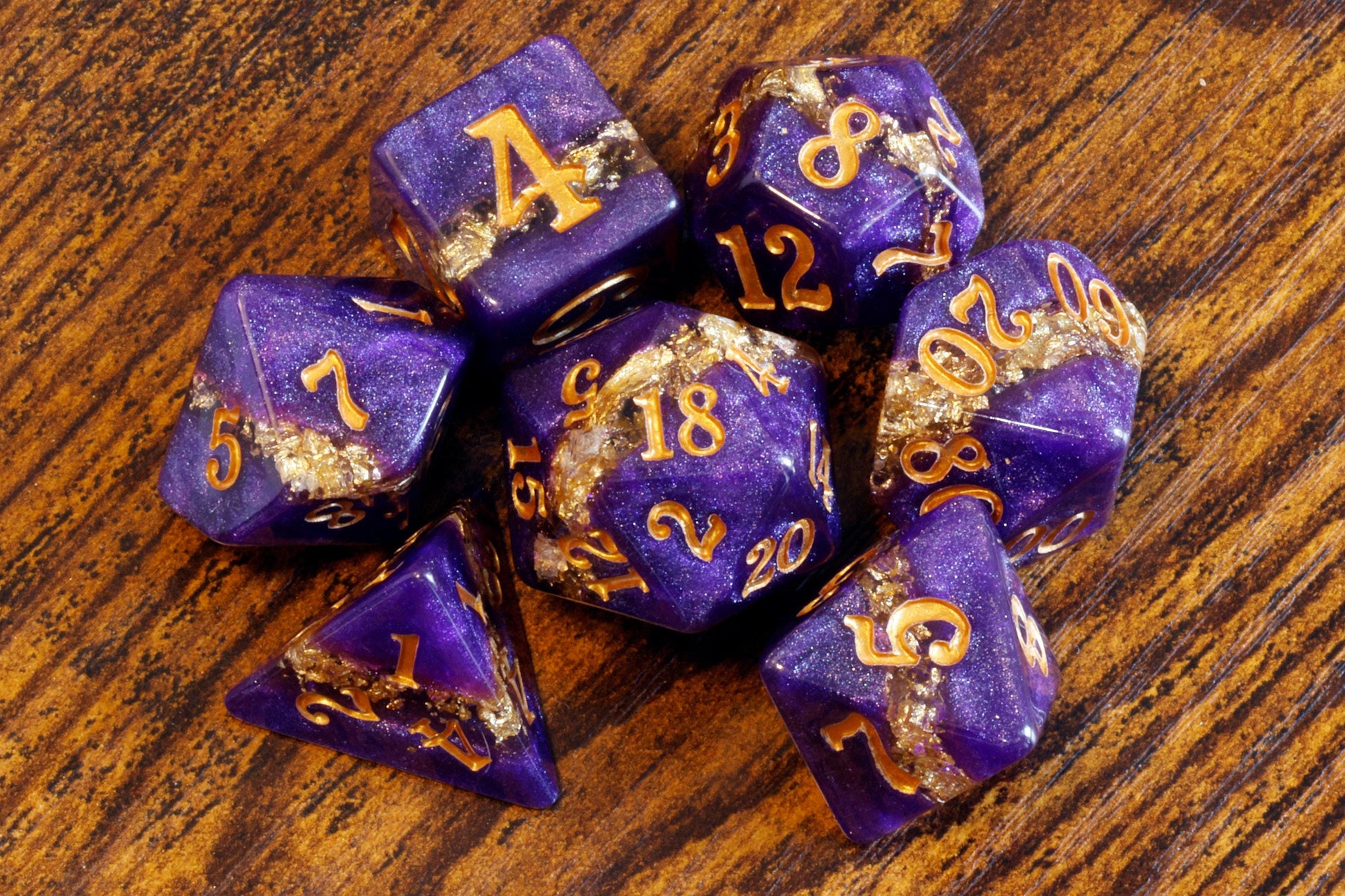 Dés en résine violette avec de magnifiques éclats dorés, évoquant le raffinement et la magie ancienne.