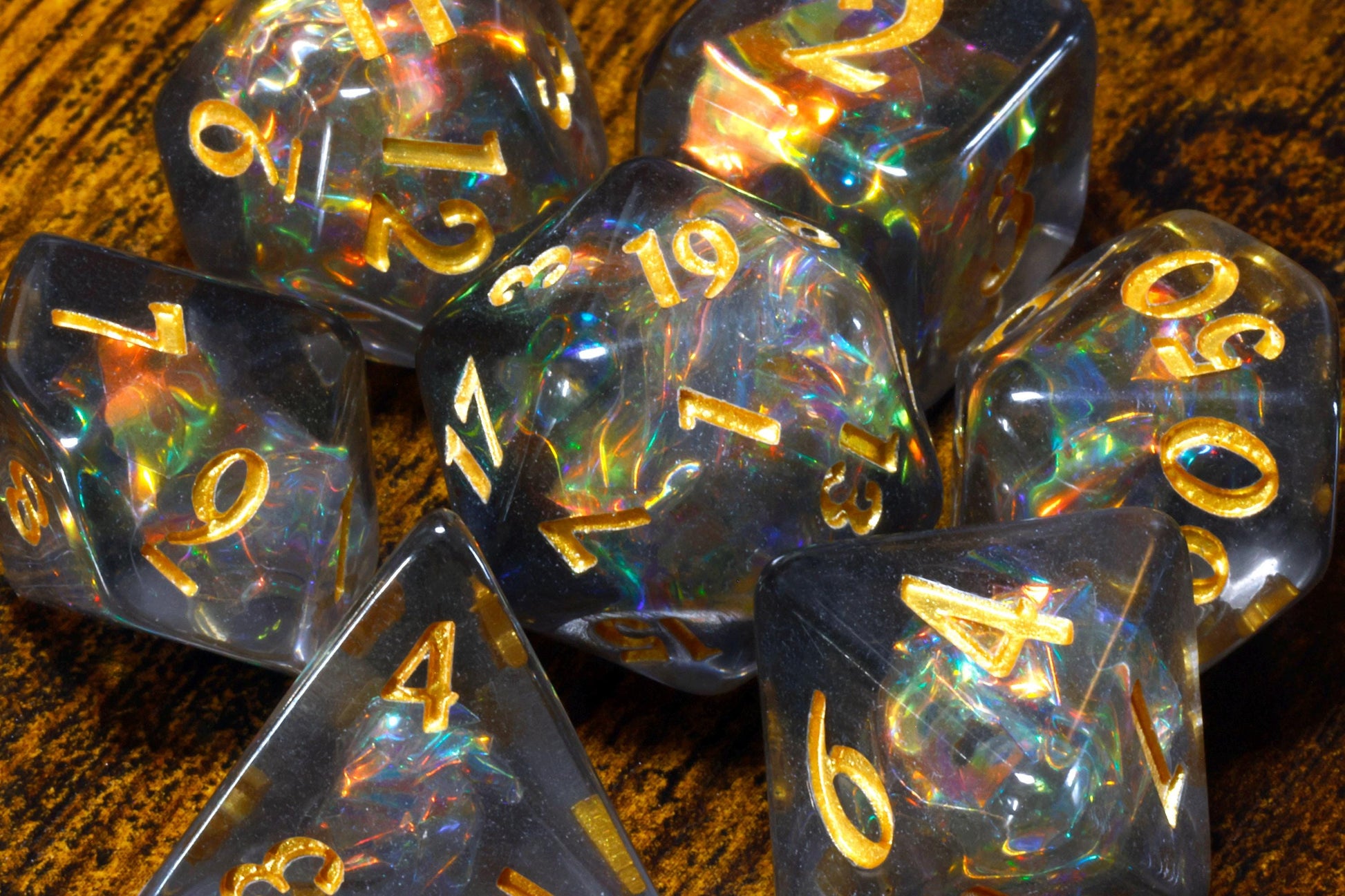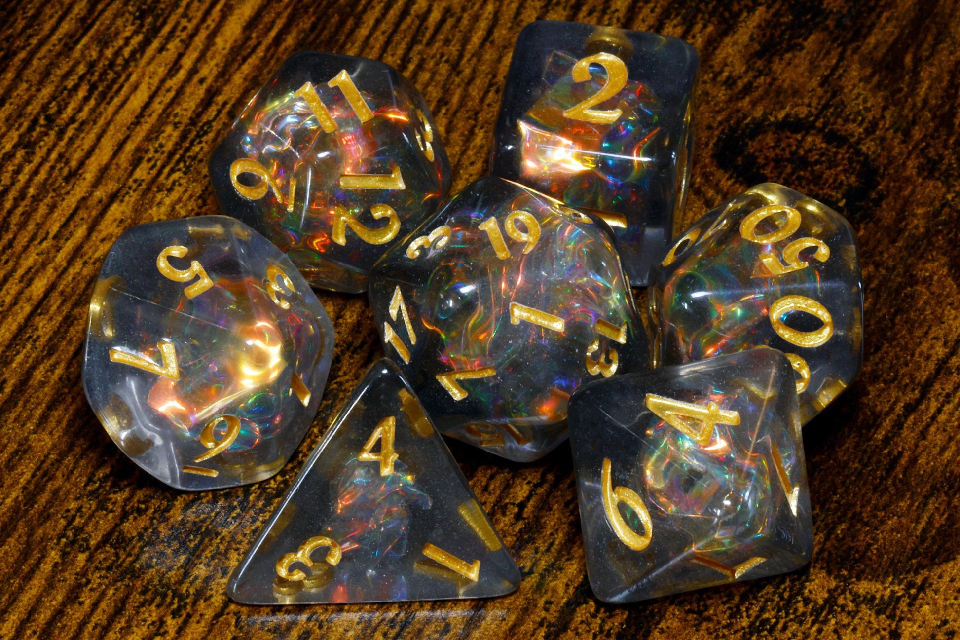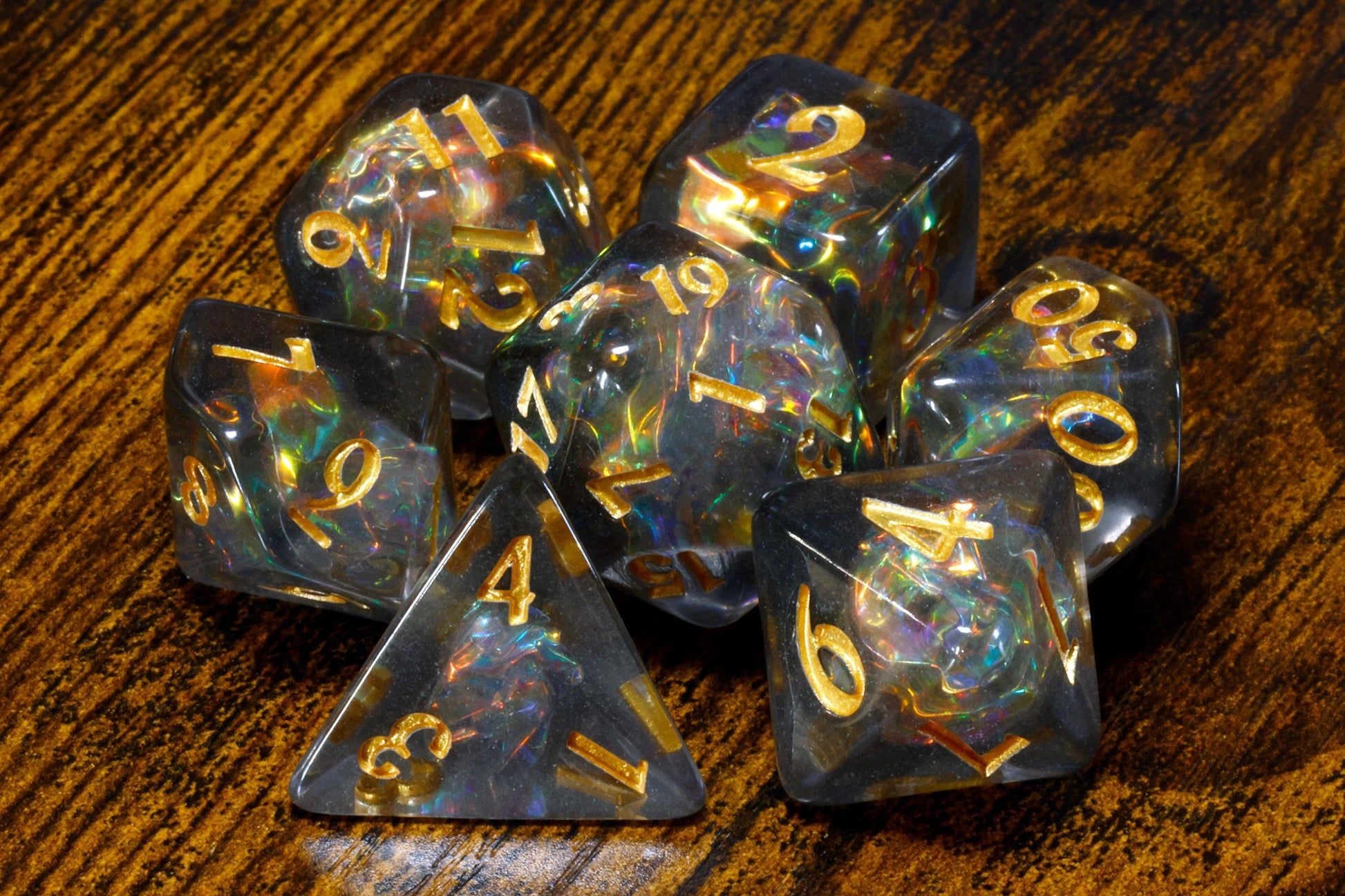 Un ensemble de dés sombres avec des reflets holographiques scintillants, parfait pour les lanceurs de sorts et aventuriers mystérieux.